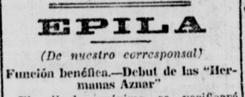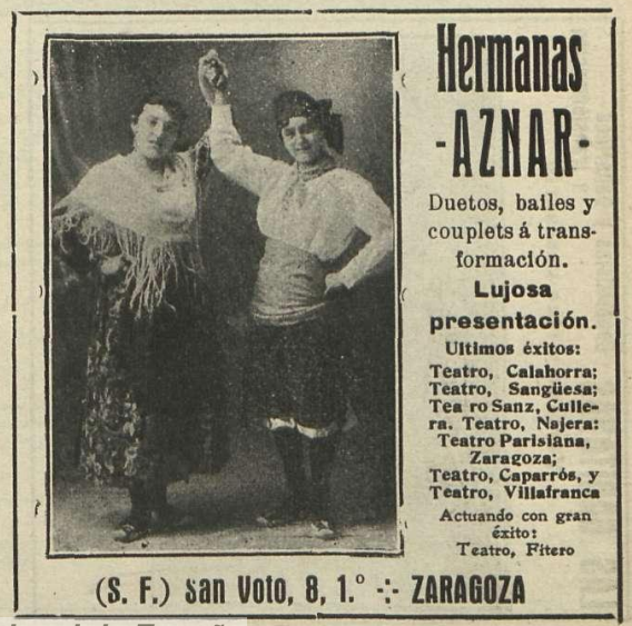 – “Variedades”, Heraldo de Aragón, 9 de junio de 1916, p. 9. [Las bailarinas hermanas Aznar son dos muchachas que empiezan, pero que están llamadas a ocupar un lugar preferente en el arte coreográfico, fueron aplaudidas]