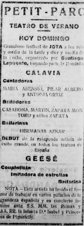 – “Espectáculos”, La Crónica de Aragón, Zaragoza, 8 de junio de 1916, p. 5. [Teatro variedades]