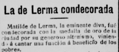 – “Salamanca al día”, Noticiero salmantino, 5 de octubre de 1899, p. 3. [la primera tiple de ópera señorita Matilde de Lerma, que acaba de regresar de una tournee por América, ha sido contratada por la empresa del teatro Real de Madrid]