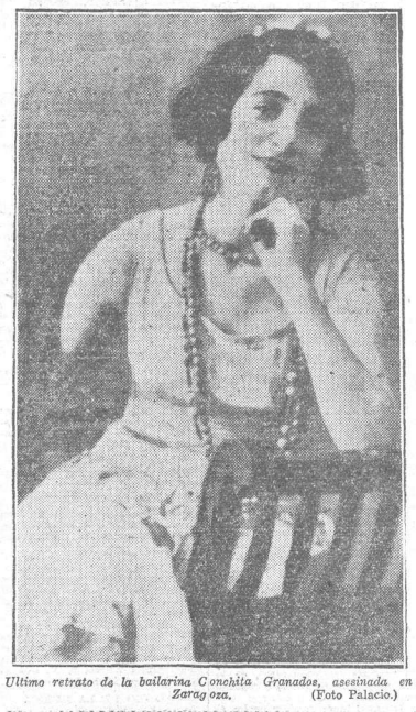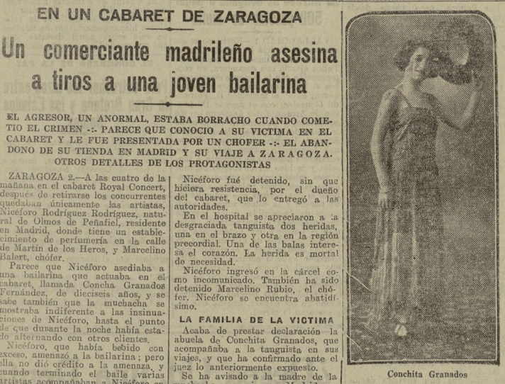 Tan solo tenía dieciséis años cuando fue asesinada mientras trabajaba como bailarina. Así relató lo ocurrido La Voz de Aragón: «Un hombre embriagado ha disparado un tiro contra una artista, matándola. El agresor se llama Nicéforo Rodríguez Rodríguez, de 25 años, natural de Olmos de Peñafiel (Valladolid), industrial, soltero, con residencia en Madrid […] La víctima se llamaba Conchita Granados Fernández, de dieciséis años, natural de Madrid, artista. […] Conchita hace nueve días que vino de Madrid con otras compañeras suyas a trabajar en el Royal Concert, en calidad de bailarina. […] Desde hace unos cuatro días Nicéforo frecuentaba el Royal, donde procuraba siempre alternar con Conchita […] de la que decía se hallaba enamorado. Hacía a la muchacha insistentes requerimientos sin que ella le diera oídos, ni tuviera con él más confianzas que con otro cliente cualquiera. Hace dos días […] se exasperó y ya le dirigió algunas amenazas. […] Conchita Granados alternaba entonces con otros clientes y por este solo motivo le reiteró las amenazas que ya otro día había dirigido, diciéndole que la iba a matar. […] Conchita estaba sentada con otras compañeras alrededor de una mesa. Nicéforo de pronto se dirigió hacia donde ella se encontraba y sin decir ni una palabra sacó una pistola y disparó sobre la infeliz muchacha. […] fue trasladada al Hospital. Al ingresar en el benéfico establecimiento la desgraciada artista había ya fallecido (La Voz de Aragón, 2 de mayo de 1928, p. 7).