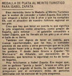 – “Medalla de plata al mérito turístico para Isabel Zapata”, Aragón exprés, 24 de julio de 1973, p. 7.