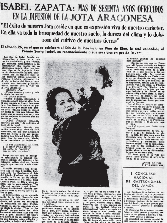 – DE UÑA Y VILLAMEDIANA, Angel, “Isabel Zapata: Más de sesenta años ofrecidos en la difusión de la Jota aragonesa”, El Noticiero, 18 de septiembre de 1970, p. 19.